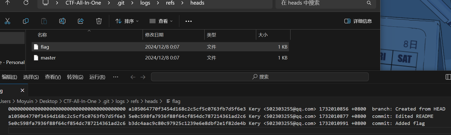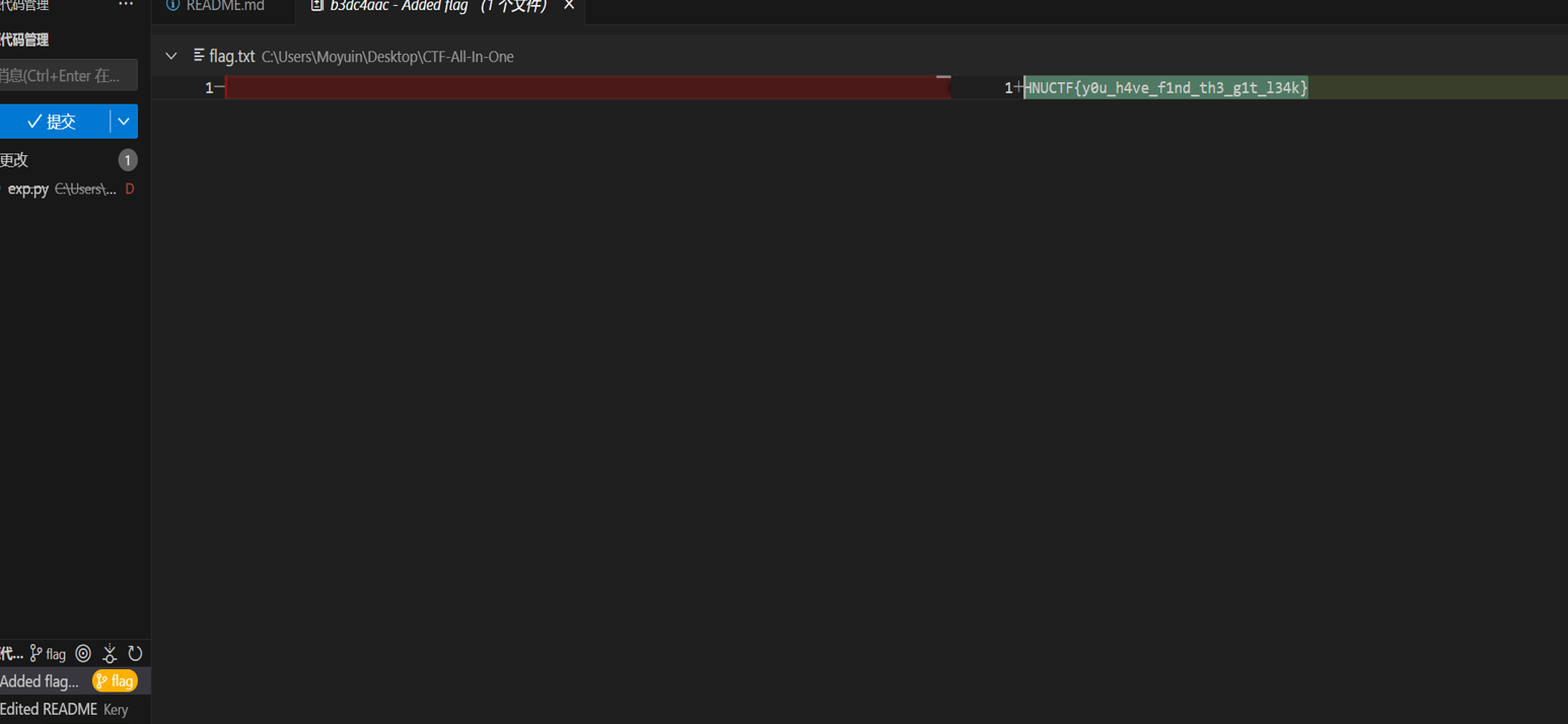 打开下载的文件,看见flag.txt打开: 那我就下一个Typora吧。学长有心了,给新生这样的小建议。 说里有个flag,开找“这里”,题目也说了是“git leak”。 刚好,打开.git翻找,发现有一个文件叫flag,说明git里面有有关flags的记录! 打开得到: 刚好vscode里面有一个git插件,就导入进去看看记录吧。 Flag在git里面leak咯。