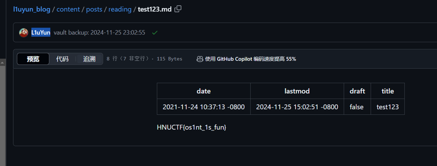 去bing搜搜信安协会会长L1uYun 找到了他的github! 然后在他的blog里看他最近的submit的文件 发现了 交上去发现不对,很怪,结合聊天记录说有干扰项,另辟思路看看其他大佬的。 发现了一个健身学长yulv706的github仓库! 其实还有一个派大星学长的,但是派大星学长直接说是HNUCTF{fake_flag},故直接提交可用的flag。 因为健身佬的blog好久没更新了,所以我只要看最新的更新一直点一直点,然后看到HNUCTF复制粘贴就好了。或者直接去他的博客检索HNUCTF,也可以得到含有这个flag的博客文章。顺便学到了一些ctf知识 提交成功。 大家平时也要注意自己的个人信息能不能直接被搜索引擎搜到哦…😑
