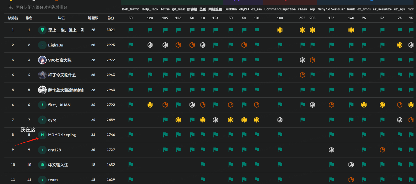 作为新生打这场ctf还是很开心的!这一次新生杯严格来说算是自己的第一次网安的比赛,感觉和acm很不一样,也更好玩一些,像一系列趣味游戏! 前面的大佬还是超级多!!有ak的!太强了,和前一名的这位新生大佬差快800分了,但是作为新生,第一次尝试这场比赛我已经很知足,边打边学新知识,实践出真知! 虽然reverse和pwn没写出来几个哈哈哈,但是web和misc做了很多,还是很感兴趣的,以后要选比赛方向的话,这两个很有趣,可能会选。 但是pwn的操作很像 《Hacknet》的玩法,这个更符合我对hacker的印象了,超级酷,reverse有点难难的,涉及到编译基础,也激励着我在之后的学习中多多了解。