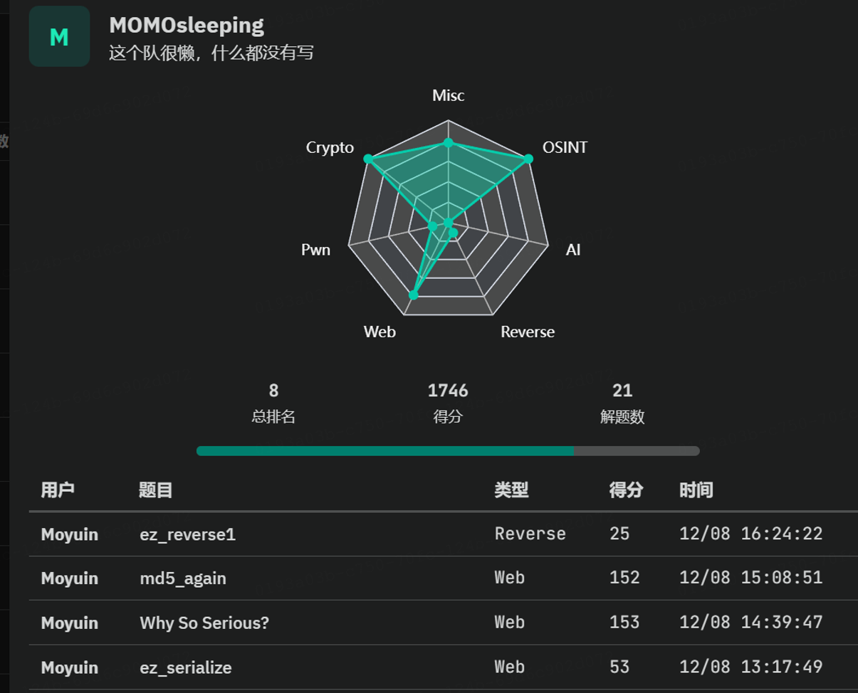 虽然reverse和pwn没写出来几个哈哈哈,但是web和misc做了很多,还是很感兴趣的,以后要选比赛方向的话,这两个很有趣,可能会选。