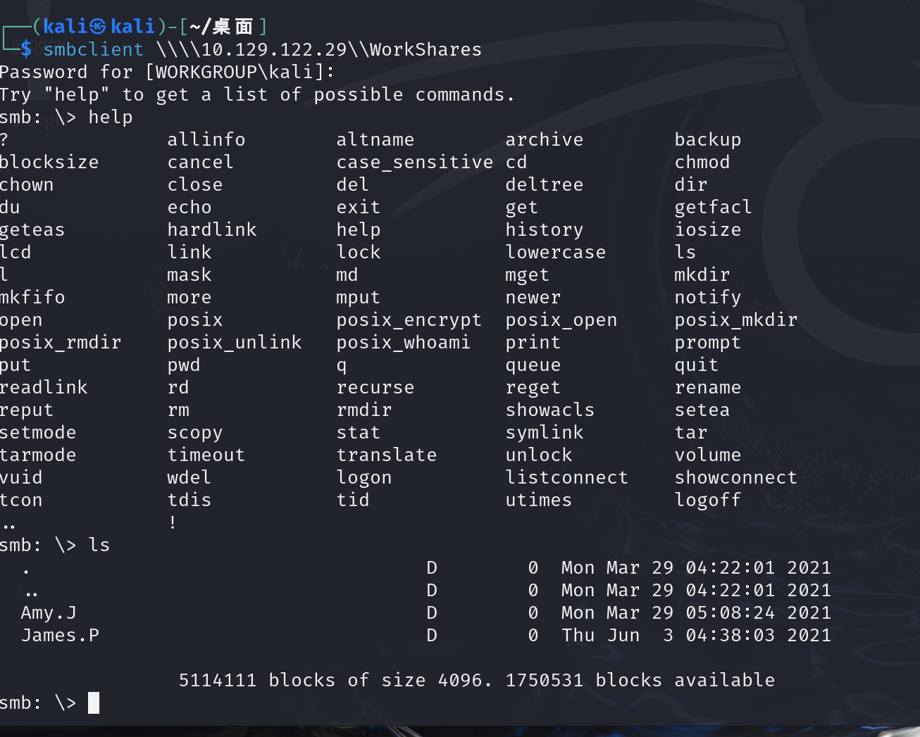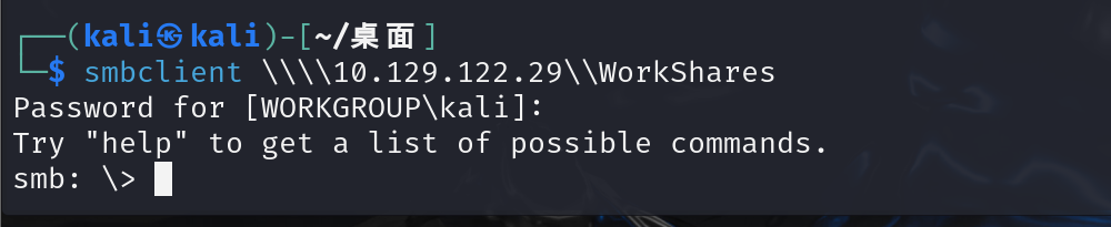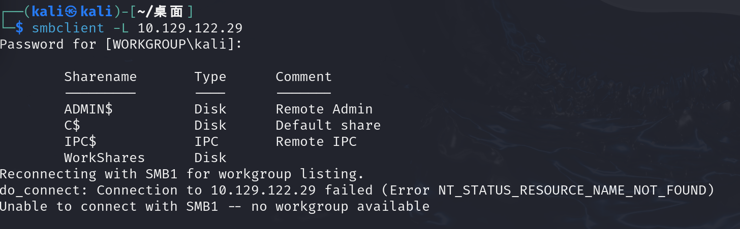 使用 smbclient \\\\{target_ip}\\{用户名} ,用于登陆,可是密码怎么办呢?使用空密码,一个一个账户试一试。